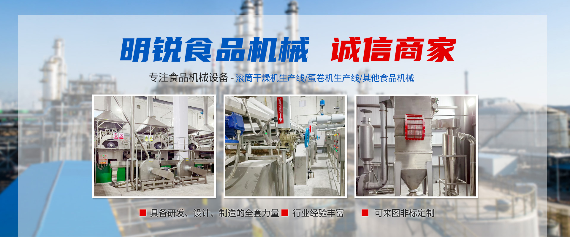 東臺(tái)市明銳食品機(jī)械有限公司是一個(gè)從事食品機(jī)械設(shè)備設(shè)計(jì)、制造和安裝調(diào)試的專業(yè)廠家,在食品生產(chǎn)工藝、生產(chǎn)流程及設(shè)備設(shè)計(jì)和制造有著多年豐富經(jīng)驗(yàn)。主要產(chǎn)品有蛋卷機(jī)生產(chǎn)系列,滾筒干燥機(jī)生產(chǎn)線系列以及其他食品機(jī)械。目前各種生產(chǎn)線規(guī)格齊全,國(guó)內(nèi)技術(shù)優(yōu)良,產(chǎn)品遠(yuǎn)銷亞洲各國(guó)及國(guó)內(nèi)二十多個(gè)省市自治區(qū)。